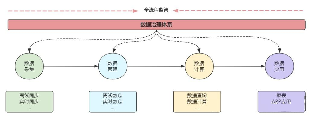 整体流程数据治理体系将全程监管。要确认进出系统的数据质量怎么样?是否可转化数据资产?数据血缘是否可追溯、数据安全等问题。