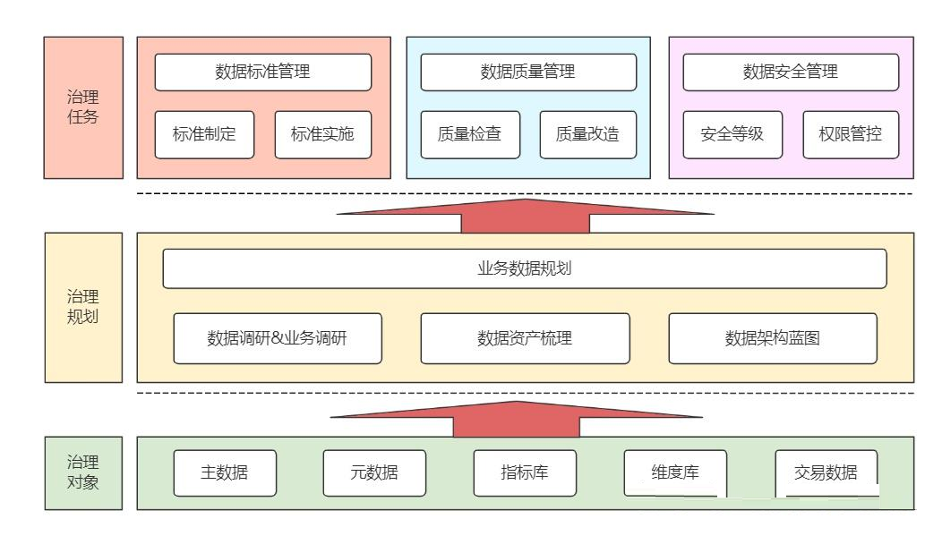 企业数据治理体系包括数据质量管理、元数据管理、主数据管理、数据资产管理、数据安全及数据标准等内容。