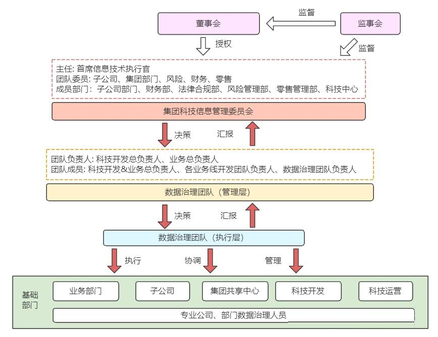 一般在数据治理建设初期,集团会先成立数据治理管理委员会。从上至下由决策层、管理层、执行层构成。决策层决策、管理层制定方案、执行层实施。层级管理、统一协调。
