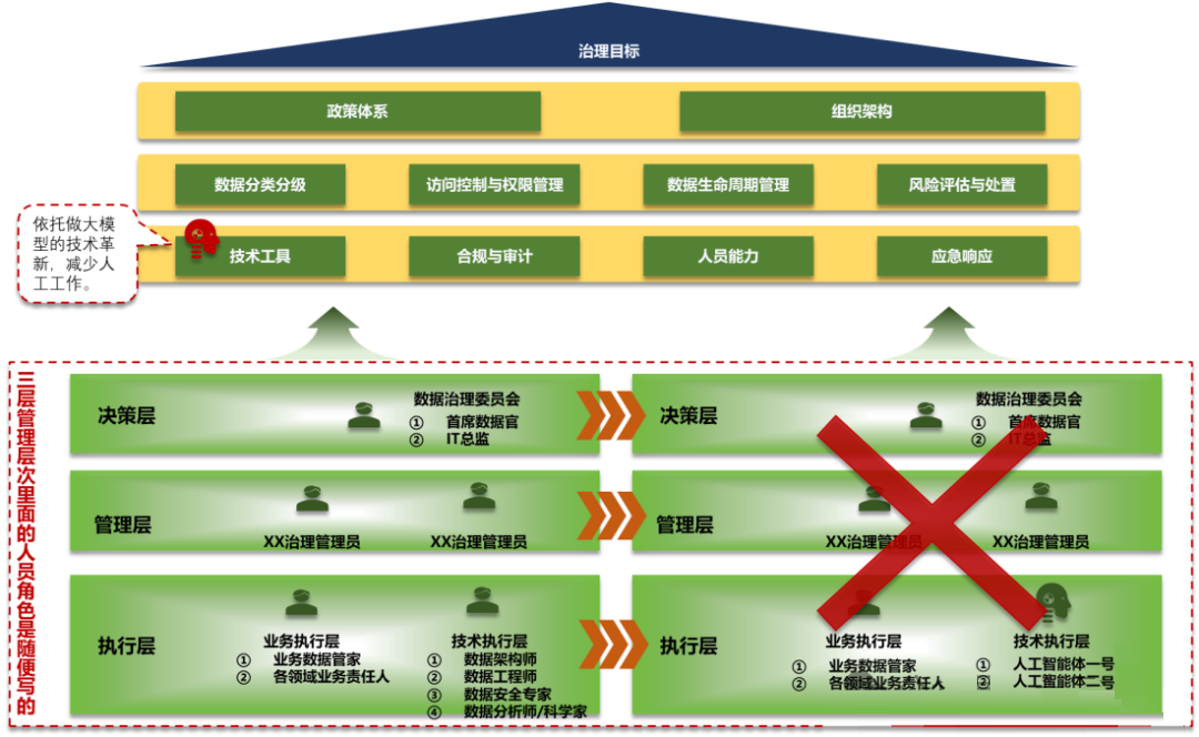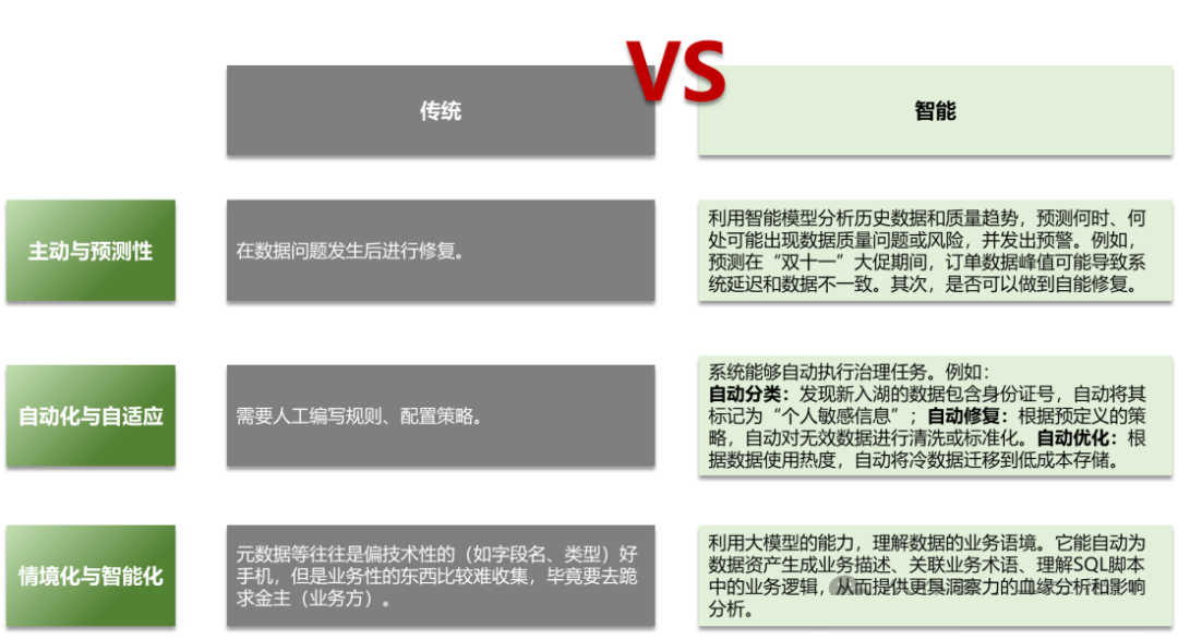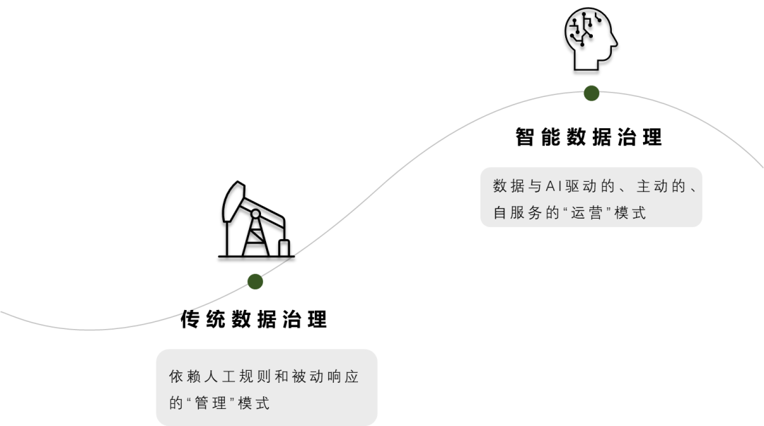 智能数据治理是传统数据治理在大模型的智能技术加持下的演进形态。它不仅仅是使用新工具,而是一种理念、方法和能力的根本性升级。其核心在于,将数据治理从依赖人工规则和被动响应的“管理”模式,转变为由数据与AI驱动的、主动的、自服务的“运营”模式。
