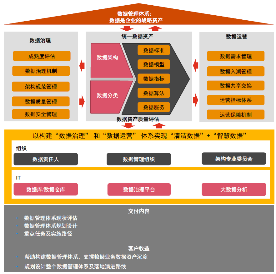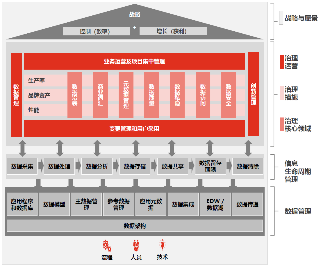 数据治理:依托企业数据管理实践,形成企业数据战略、治理组织人才、规范流程,为数据驱动业务运营提供基础保障。