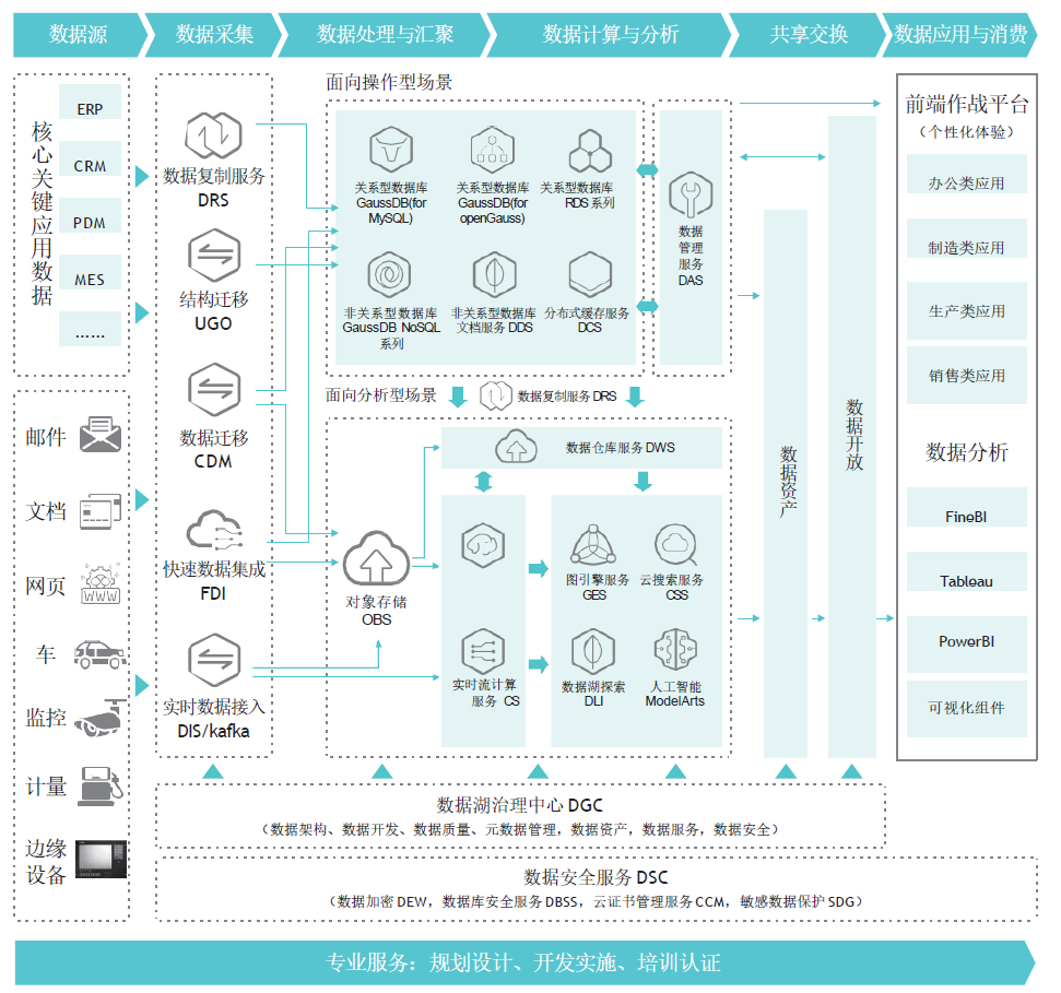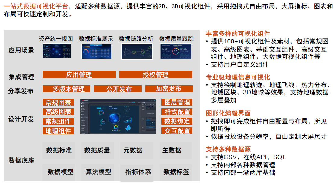 数据集成、数据治理、服务开发、数据服务、可视化工具,从而实现数据从采集、存储、管理、计算、分析利用和数据交互的功能。
