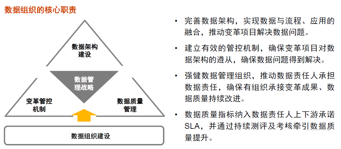 建议数据组织的核心职责聚焦如下四个方面:数据架构建设、变革管控机制、数据质量管理、数据质量指标纳入数据责任人的绩效考核。