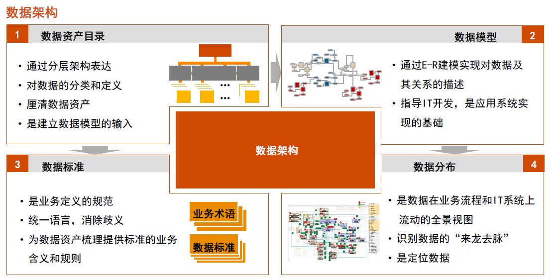 数据架构包括数据资产目录、数据标准、企业级数据模型和数据分布四个组件。