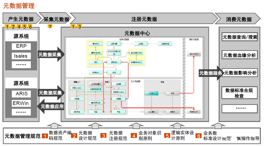规范元数据的产生:定义元数据分类和元数据实体,明确元数据设计原则、规范和方法,指导元数据管理平台和元数据设计工具的选型与建设,支撑数据和IT人员进行元数据的设计、管理及应用。