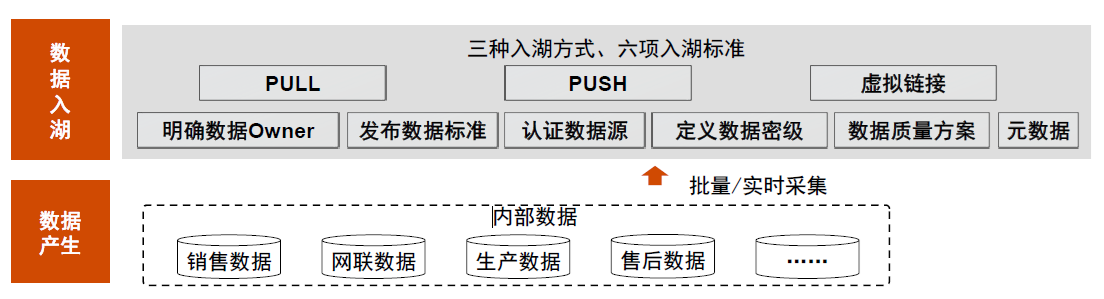 数据集成用来完成数据入湖动作,不是简单的数据搬家,而是按照一定的方法论进行数据备份。数据入湖的前提条件是满足6项数据标准,包括:明确数据责任人、发布数据标准、定义数据密级、明确数据源、数据质量评估、元数据注册。此标准由数据代表在入湖前完成梳理并在数据治理平台上进行资产注册。
