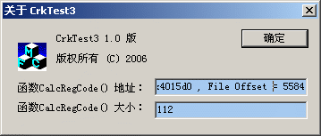 计算nEndPos和nStartPos的差值就是关键代码块的大小。从内存地址计算出文件偏移位置的方法和上一节介绍的方法一样,使用VAtoFileOffset()函数计算出这个偏移量,然后使用“关于...”对话框的隐蔽功能显示给软件开发人员。其它问题,比如异常处理、Debug版函数地址修正以及修改代码段的读写属性等等问题都已经在上一节介绍了,此处不再赘述,具体内容可参考CrkTest2的例子代码,演示程序CrkTest2的使用方法和上一节的例子程序CrkTest3类似,程序编译完成以后要使用CryptExe.exe对关键代码加密,否则会出现指令异常。