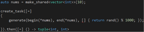 前面曾经说过,我们传给create_task函数的Lambda可以有返回值,这个返回值将会通过参数传给后续的continuation,我们可以通过这个机制把那些变量内化到Lambda里,如代码14所示。