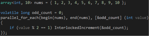 Lambda》里,我们通过for_each函数数一下随机生成的整数里有多少个奇数,这个过程可以并行化吗?可以的,一般的做法是声明一个变量存放个数,在迭代的过程中一旦发现奇数就递增一下这个变量,由于涉及到多线程,可以通过系统提供的InterlockedIncrement函数确保递增操作的安全,如代码5所示。