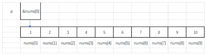 上面语句定义了一个数组 nums,在定义时分配了 10 个连续的int 内存空间。而一个数组的首地址即为数组名nums,或者第一个元素的首地址也是数组的首地址。那么有两种方式让指针变量 p 指向数组 nums: