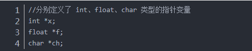 如上面的定义,指针变量名为 x、f、ch。并不是*x、*f、*ch