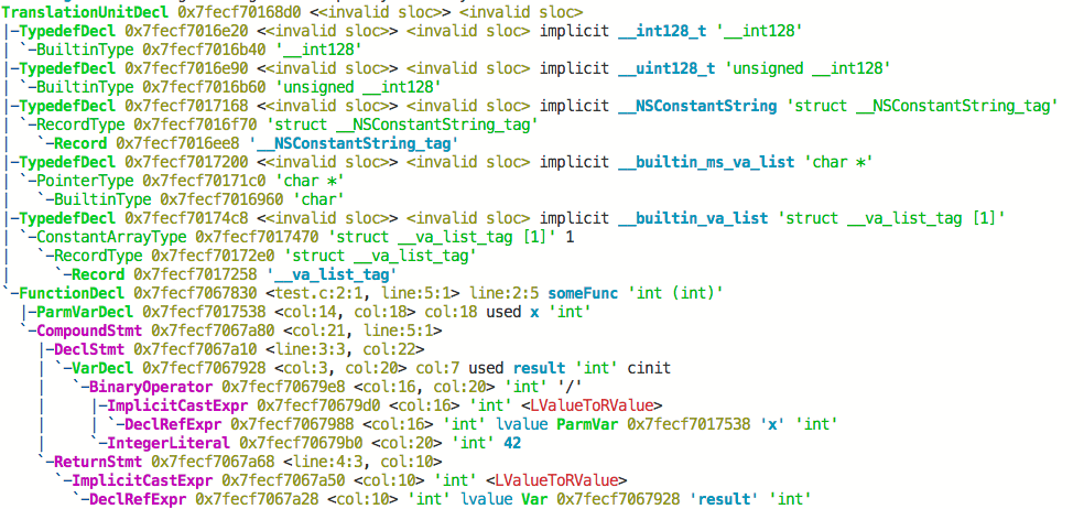Clang AST也没有脱离这个本质,但它跟其他编译器所生成的 AST相比多了很多非常有用的东西,这些东西可以让