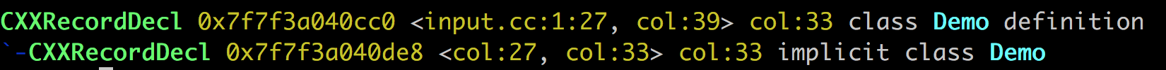 $ ./findNameClass "namespace ClangTutorial { class Demo {}; }"