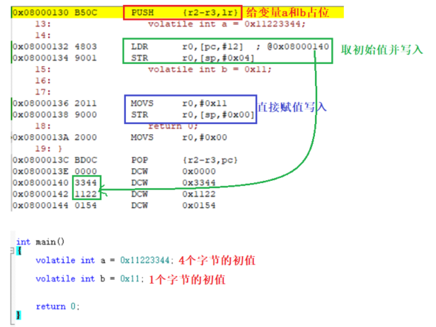 对于初始值为0x11223344的初始化,两个字节的指令无法容纳四个字节的初值,所以必需取Flash中取初值到寄存器中,然后再进行赋值。
