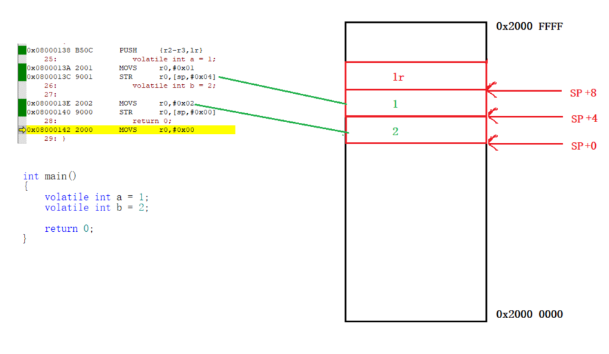 如上图,main函数开辟一次栈,SP位于上图红色位置,栈里有变量a和b以及main函数的返回地址lr。
