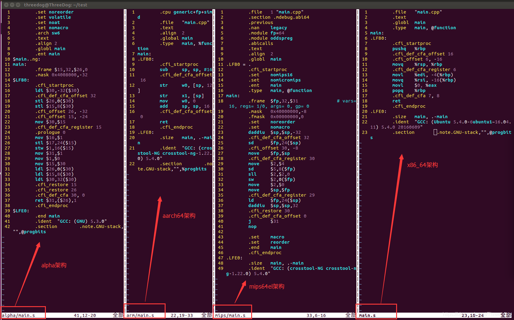 汇编代码中生成的是和CPU架构相关的汇编指令,不同CPU架构采用的汇编指令集不同,生成的汇编代码也不一样: