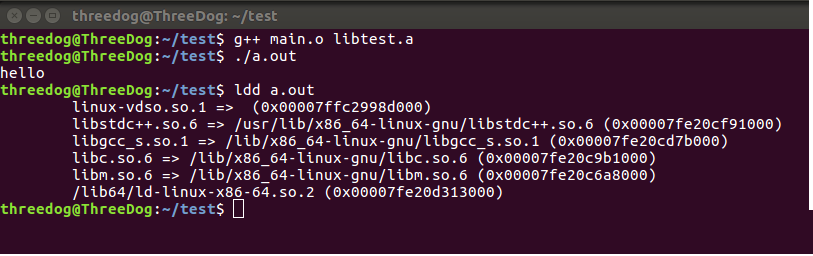 LIBRARY_PATH=. g++ main.o -ltest,或LIBRARY_PATH=/home/threedog/test/