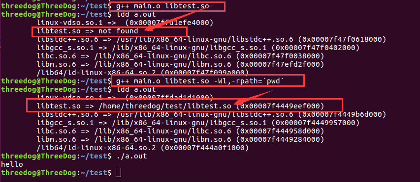 g++ main.o -ltest -L.,或g++ main.o -ltest -L/home/threedog/test/