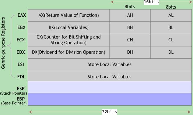 Intel 32位体系结构(简称IA32)处理器包含8个四字节寄存器,如下图所示: