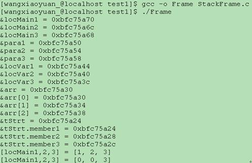注意,局部变量的布局依赖于编译器实现等因素。因此,当StackFrameContent函数中删除打印语句时,变量locVar3、locVar2和locVar1可能按照从高到低的顺序依次存储!而且,局部变量并不总在栈中,有时出于性能(速度)考虑会存放在寄存器中。数组/结构体型的局部变量通常分配在栈内存中。