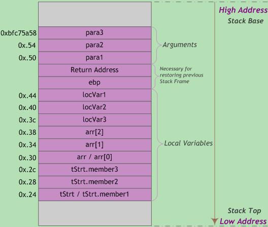 函数栈布局示例如下图所示。为直观起见,低于起始高地址0xbfc75a58的其他地址采用点记法,如0x.54表示0xbfc75a54,以此类推。