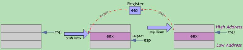 压栈(push):栈顶指针ESP减小4个字节;以字节为单位将寄存器数据(四字节,不足补零)压入堆栈,从高到低按字节依次将数据存入ESP-1、ESP-2、ESP-3、ESP-4指向的地址单元。
