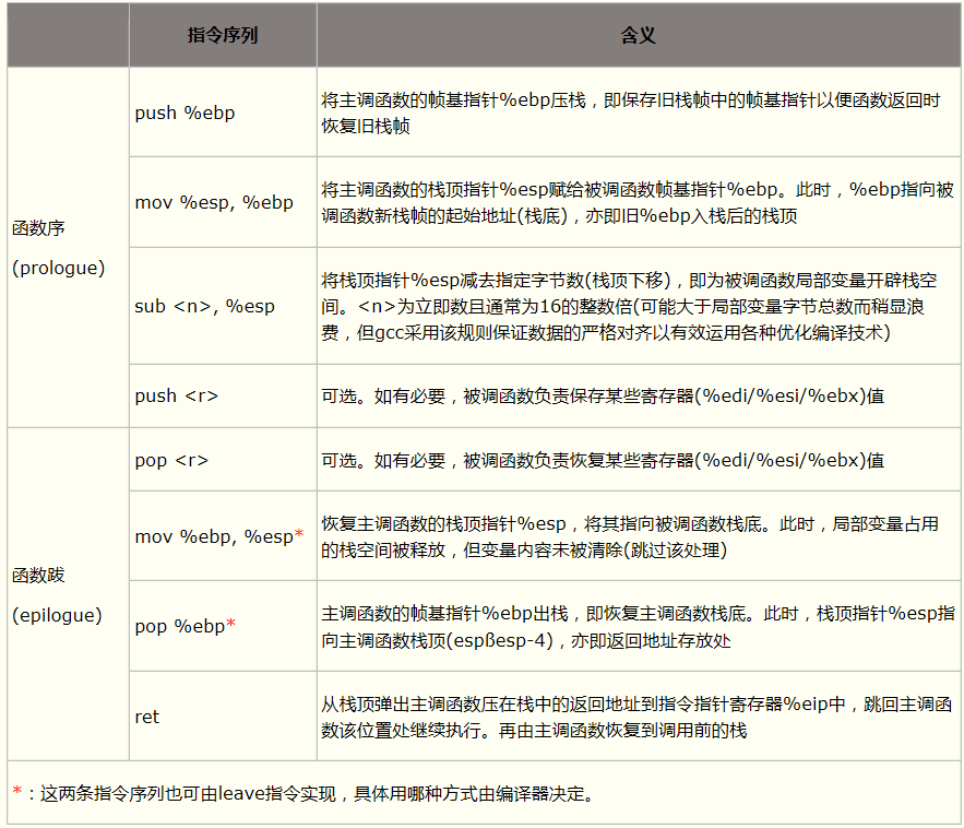 为更具描述性,以下称EBP为帧基指针, ESP为栈顶指针,并在引用汇编代码时分别记为%ebp和%esp。
