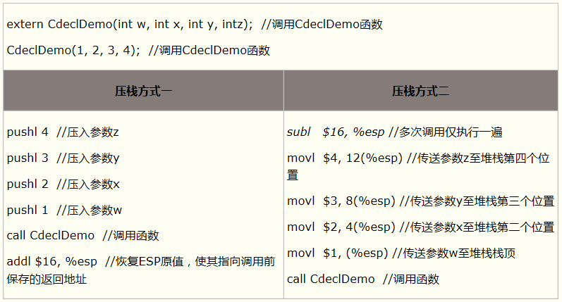 参数压栈指令因编译器而异,如下两种压栈方式基本等效: