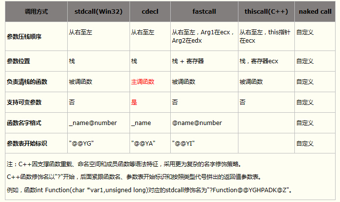 EAX 中。因为并不是所有的参数都有压栈操作,所以比stdcall和cdecl快些。编译器使用两个@修饰函数名字,后跟十进制数表示的函数参数列表大小(字节数),如@function_name@number。需注意fastcall函数调用约定在不同编译器上可能有不同的实现,比如16位编译器和32位编译器。另外,在使用内嵌汇编代码时,还应注意不能和编译器使用的寄存器有冲突。