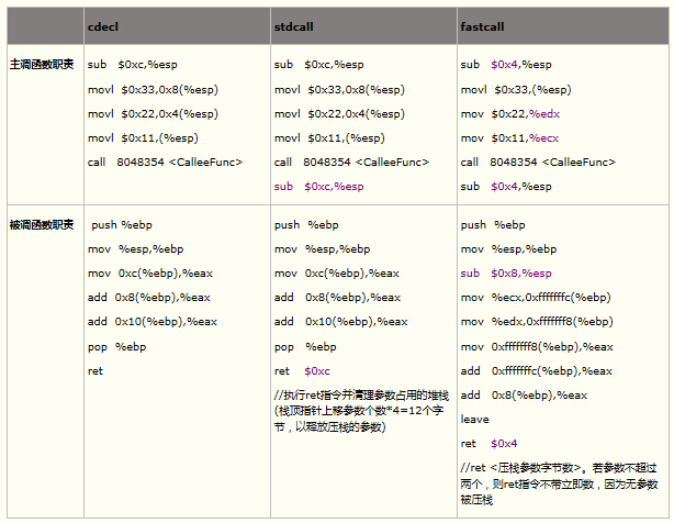 被调函数CalleeFunc分别声明为cdecl、stdcall和fastcall约定时,其汇编代码比较如下表所示: