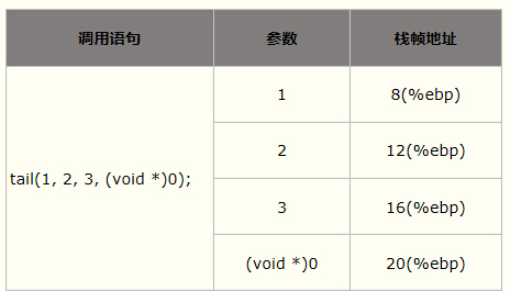 整型参数与指针参数的传递方式相同,因为在32位x86处理器上整型与指针大小相同(均为四字节)。下表给出这两种类型的参数在栈帧中的位置关系。注意,该表基于tail函数的栈帧。