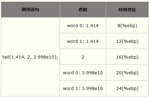 浮点参数的传递与整型类似,区别在于参数大小。x86处理器中浮点类型占8个字节,因此在栈中也需要占用8个字节。下表给出浮点参数在栈帧中的位置关系。图中,调用tail函数的第一个和第三个参数均为浮点类型,因此需各占用8个字节,三个参数共占用20个字节。表中word类型的大小是4字节。