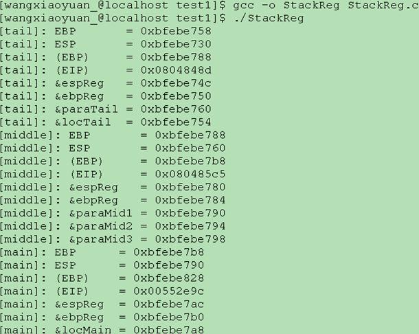 该程序每个函数都嵌入汇编代码,以获取各函数运行时刻EBP和ESP寄存器的值。每个函数都打印出EBP寄存器所指向内存地址处的值,以及位于其后的函数返回地址。图7给出程序的编译和运行结果。