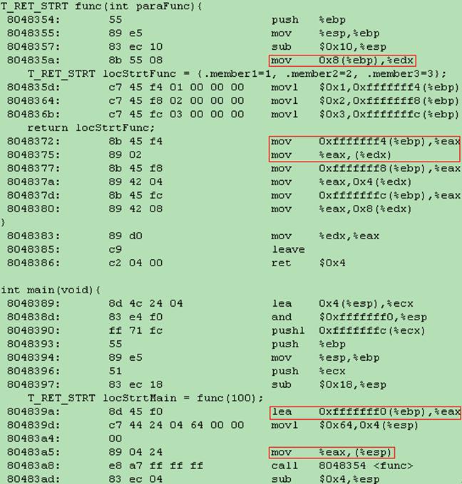 注意,若T_RET_STRT locStrtMain = func(100)改为func(100),主调函数栈上仍会预留一个结构体变量的空间,然后将该变量地址存入%eax寄存器。<指令8048397>和<指令804839a>分别变为sub