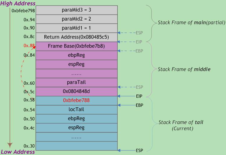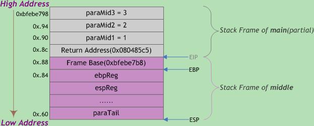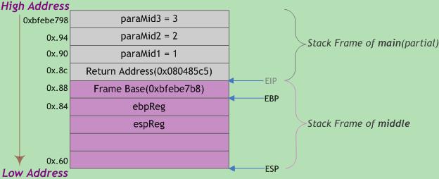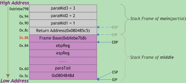 随后,将执行middle函数体。执行过程中帧基指针EBP保持不变,通过该指针加偏移量即可访问函数实参、局部变量和临时存储内容。即使middle函数内调用其他函数(如tail),甚至递归调用middle自身,只要在这些子调用返回时恢复EBP,就可继续用EBP加偏移量的方式访问实参等信息。