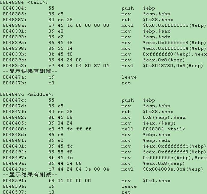 内存地址0x804847c~0x804847f的指令用于形成middle函数的栈帧。第一条指令(位于地址0x804847c处,简称<指令804847c>)将主调函数main的栈帧基址保存到栈上(压栈操作),该地址用于从被调函数堆栈返回到主调函数main中。正是各函数内的这一操作,使得所有栈帧连在一起成为一条链。