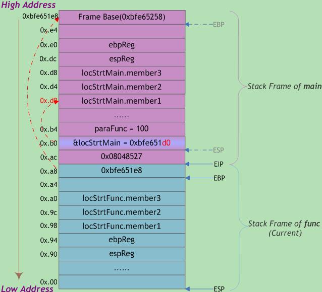 从图中可看出,main函数调用func函数时除将后者所需的参数压入栈中外,还将局部变量locStrtMain地址也压入栈中;func函数返回时将locStrtFunc变量的值通过该地址直接拷贝到main函数的locStrtMain变量中,从而省去一次通过栈的中转拷贝。