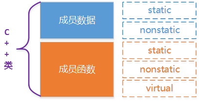 概括来说,在C++类中有两种成员数据:static、nonstatic;三种成员函数:static、nonstatic、virtual。
