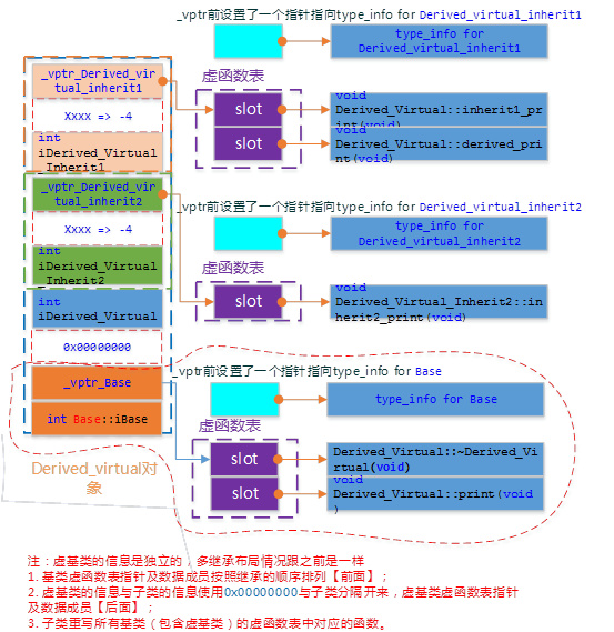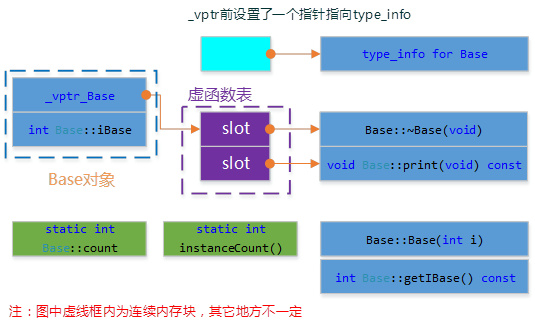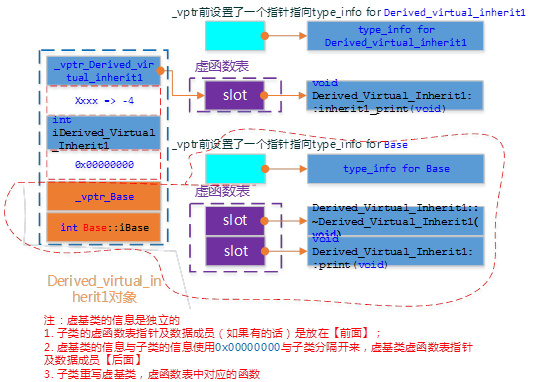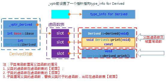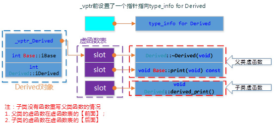 另外,虚函数表地址的前面设置了一个指向type_info的指针,RTTI(Run Time Type