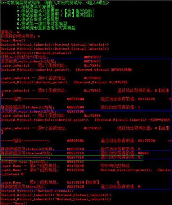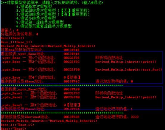 void test_multip_vitrual_inherit() { Derived_Virtual dvi1(88888); cout << "对象dvi1的起始内存地址:\t\t" << &dvi1 << endl; cout << "虚函数表_vptr_inherit1地址:\t\t" << (int*)(&dvi1) << endl; cout << "_vptr_inherit1 — 第1个函数地址:\t" << (int*)*(int*)(&dvi1) << endl; typedef void(*Fun)(void); Fun pFun = (Fun)*((int*)*(int*)(&dvi1)); pFun(); cout << endl; cout << "_vptr_inherit1 — 第2个函数地址:\t" << ((int*)*(int*)(&dvi1) + 1) << endl; pFun = (Fun)*((int*)*(int*)(&dvi1) + 1); pFun(); cout << endl; cout << "_vptr_inherit1 — 第3个函数地址:\t" << ((int*)*(int*)(&dvi1) + 2)