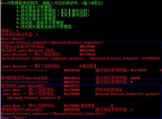 << "【结束】\t" << *((int*)*((int*)(&dvi1) +4) +2); cout << endl; cout << "推测数据成员iBase地址:\t\t" << ((int*)(&dvi1) +5)