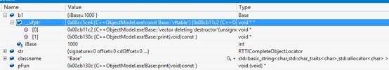 void test_base_model() { Base b1(1000); cout << "对象b1的起始内存地址:" << &b1 << endl; cout << "type_info信息:" << ((int*)*(int*)(&b1) - 1) << endl; RTTICompleteObjectLocator str= *((RTTICompleteObjectLocator*)*((int*)*(int*)(&b1) - 1)); //abstract class name from RTTI string classname(str.pTypeDescriptor->name); classname = classname.substr(4,classname.find("@@")-4); cout << classname <<endl; cout << "虚函数表地址:\t\t\t" << (int*)(&b1) << endl; cout << "虚函数表 — 第1个函数地址:\t" << (int*)*(int*)(&b1) << "\t即析构函数地址: