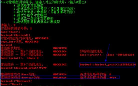 void test_single_inherit_norewrite() { Derived d(9999); cout << "对象d的起始内存地址:" << &d << endl; cout << "type_info信息:" << ((int*)*(int*)(&d) - 1) << endl; RTTICompleteObjectLocator str= *((RTTICompleteObjectLocator*)*((int*)*(int*)(&d) - 1)); //abstract class name from RTTI string classname(str.pTypeDescriptor->name); classname = classname.substr(4,classname.find("@@")-4); cout << classname <<endl; cout << "虚函数表地址:\t\t\t" << (int*)(&d) << endl; cout << "虚函数表 — 第1个函数地址:\t" << (int*)*(int*)(&d) << "\t即析构函数地址" << endl; cout << "虚函数表 — 第2个函数地址:\t" << ((int*)*(int*)(&d) + 1) << "\t"; typedef void(*Fun)(void); Fun pFun = (Fun)*(((int*)*(int*)(&d)) + 1); pFun(); d.print(); cout << endl;