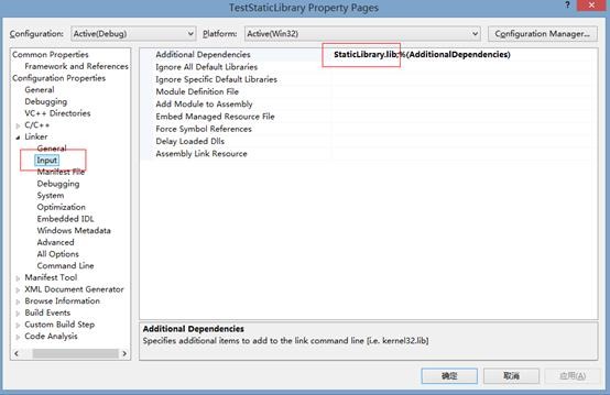 “属性面板”è”配置属性”è “链接器”è”输入”,附加依赖库中输入静态库名StaticLibrary.lib。