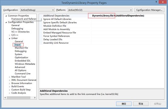 “属性面板”è”配置属性”è “链接器”è”输入”,附加依赖库中输入动态库编译出来的DynamicLibrary.lib。