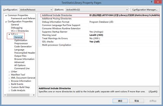 “C/C++”è” 常规”,在“附加包含目录”属性值中,键入StaticMath.h 头文件所在目录的路径或浏览至该目录。