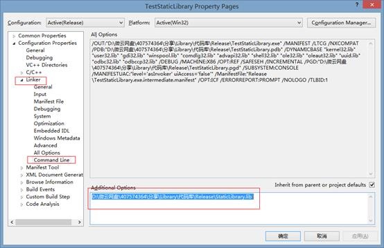 打开工程“属性面板”è”配置属性”è “链接器”è”命令行”,输入静态库的完整路径即可。
