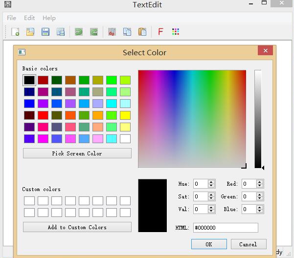 这里有必要说一下QPalette类,在Qt里每一个控件都有一个调色板,它控制着控件的所有颜色信息。对于文本区域QTextEdit控件,目前我知道两种颜色分量,字体颜色和背景颜色,值分别是QPalette::Text