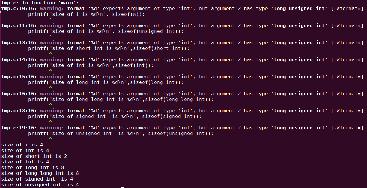 如上图所示,我们可以看到许多的 Warning,根据提示我们可以知道,这是由于sizeof返回的是一个long