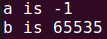 65535,所以将 -1(也就是 11111111)赋值给无符号数 b 之后输出的是 65535。